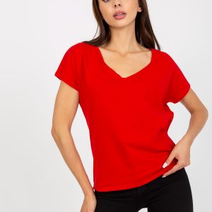 Y282 Czerwony t shirt damski bawełniany basic z dekoltem w serek s m l